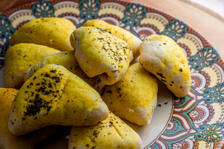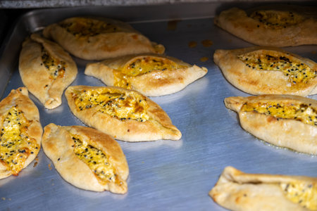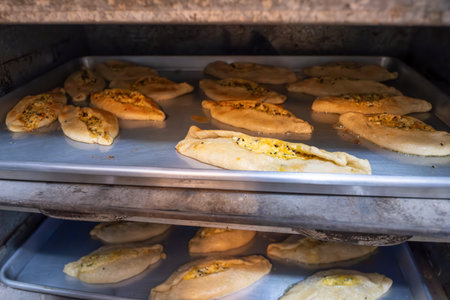 Pastries in oven being baked and freshly made of flour, olive oil and cheese, made according to jordan and palestine way