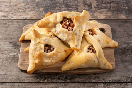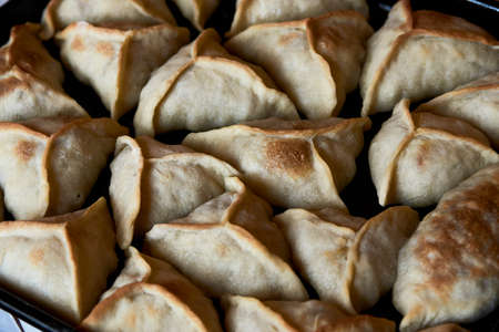 Samsa or samosas with meat and potato. Homemade baked uchpochmack. Traditional Tatar food.