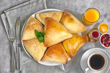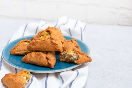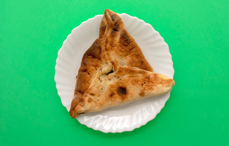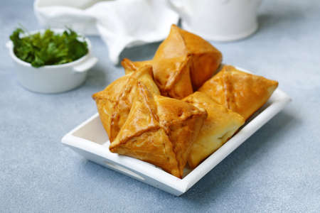 Samsa, national savory baking, usually with minced meat, cheese or vegetables as a filling, an oriental meal, Central Asia cuisine concept.
