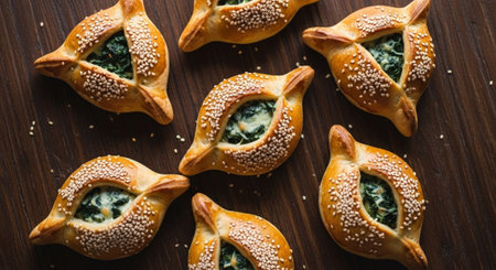 Top shot of a traditional Fatayer (or Fitir), typical Lebanese pastry, stuffed with spinach and herbs.