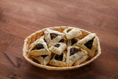 Gomentash with poppy seeds and prunes freshly baked for the Purim holiday on a wooden table in a bread basket.copy space horizontal photo.