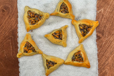 hamantaschen cookies. Jewish traditional baked goods for Purim (Jewish carnival holiday with celebration concept). Homemade cookies with poppy seeds filling