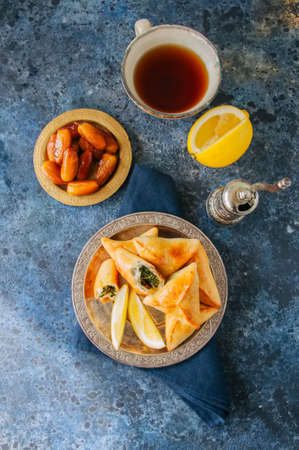 Fatayer sabanekh - traditional arabic spinach triangle hand pies in a vintage plate, dates and tea on a blue stone background. Top view.