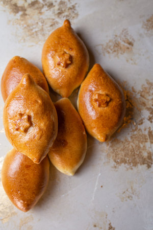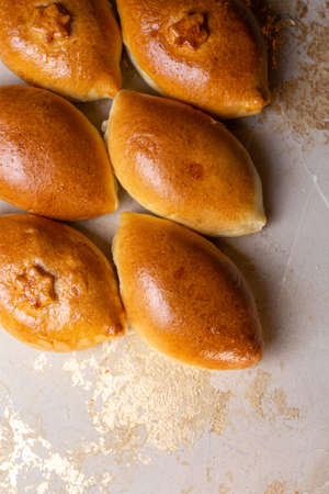 Fried homemade pies with potatoes on the kitchen table. Grandma's recipe. View from above