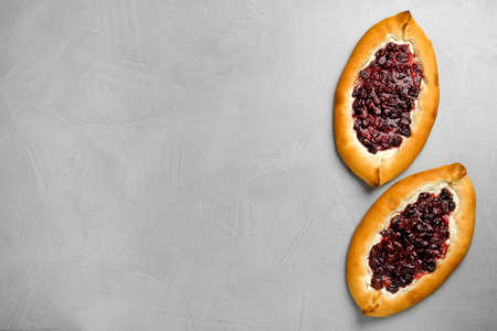 Delicious sweet cottage cheese pastries with cherry jam on gray table, flat lay. Space for text