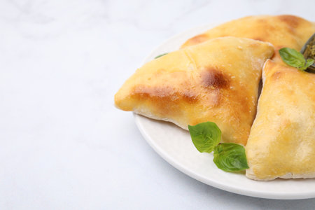 Homemade baked uchpuchmak (samsa) with meat and potato on a white stone background. Top view and copy space.