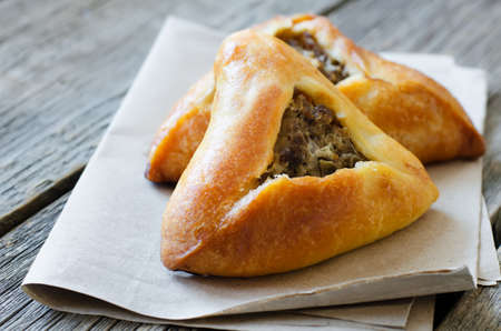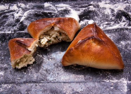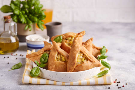 Pies with chicken, potato, onion and herbs. Small homemade kurnik meat pies in a shape of triangle. Healthy dinner for the family.