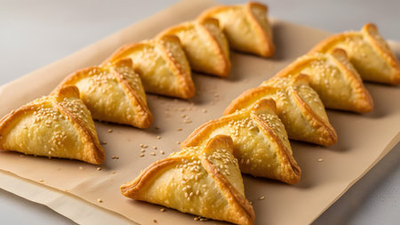 Rows of freshly baked triangular pastries topped with sesame seeds, cooling on a sheet of parchment paper. The golden puffed dough suggests a savory filling like cheese or meat, typical of Middle Eastern baking.