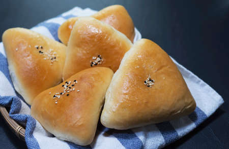 baked stuffed pastries on black marble background ready to be served and moved from tray to bowls on dinner table or in school kids back bag