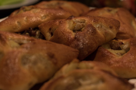 Lots of small home-baked bacon pies. traditional home baked bacon and lard patty from a yeast dough. Preparation of a little tasty traditional lard patty