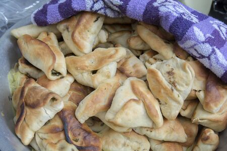 samosa national Uzbek puff pastry meal with meat or cheese filling. Ethnic cuisine. Fast street food