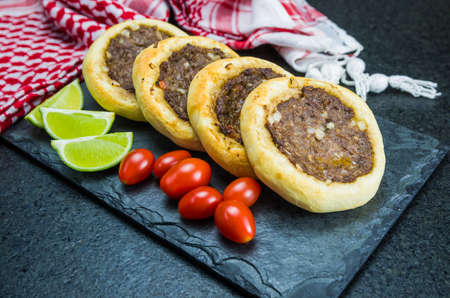 Delicious Lebanese (Arabic) food, genuine sfihas on a slate plate with tomatoes and lemons in the background with traditional Lebanese Keffiyeh (turban).