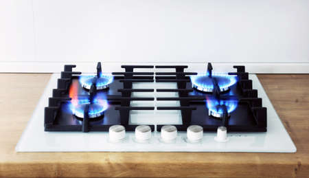 Modern kitchen stove cook with blue flames burning.