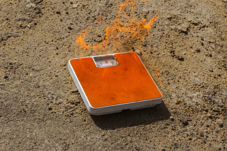 Burning floor scales on asphalt textural background. concept - burning calories, slimming and burning weight with the help of diets and sports exercises.