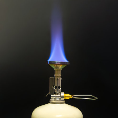 Close-up of a portable camping stove with a vibrant blue flame burning brightly against a black background, mounted on a white gas canister, showing its metallic design and practical outdoor use.