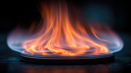 Artistic close-up of a gas flame glowing intensely on a stove burner in a dark space