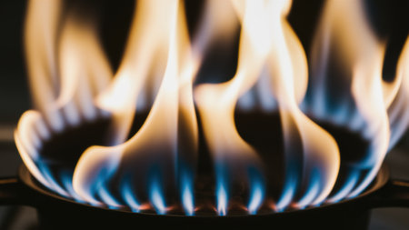 A sharp close-up captures a single gas burner glowing with dynamic orange and blue flames, evoking the lively spirit and innovation of contemporary culinary spaces.