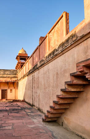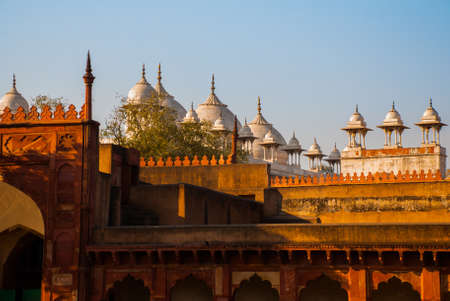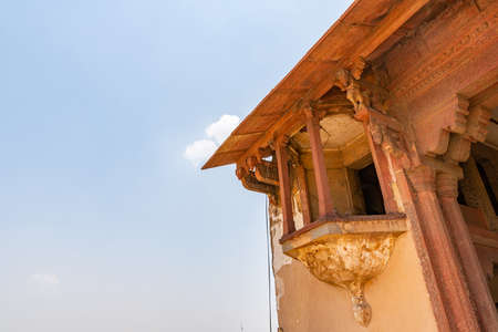 India travel tourism background - Inside view of the Red Fort, ancient tower of red stone in the fortress the dom