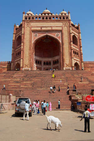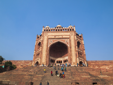 Agra, India - April 10,2014: Fatehpur Sikri a small city in northern India in the west of Agra, founded by Mughal emperor. Red sandstone buildings cluster at its center. Buland Darwaza gate is the entrance to Jama Masjid mosque.