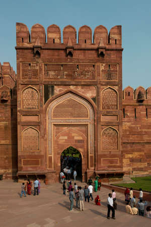 AGRA, INDIA - 23 OCTOBER 2013 - Main gate of the red Agra Fort, home of the Moghul Emperors, Now an Unesco world heritage site