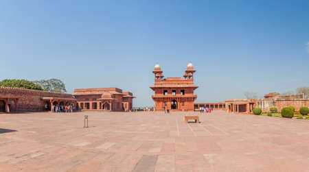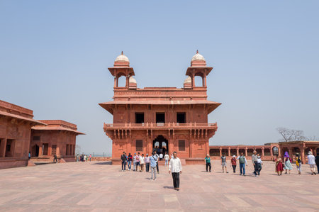 Fatehpur Sikri, India - March 12, 2024: The image shows the red sandstone Diwan-i-Khas hall with four chhatris and groups of people walking in the open courtyard of the palace complex at Fatehpur Sikri.
