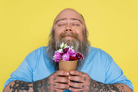 pleased bearded man with overweight smelling aromatic flowers in paper cup isolated on yellow