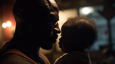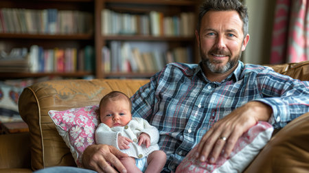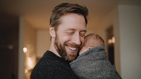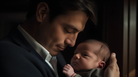 Loving father cradling newborn infant, displaying tender parental bond within soft lit domestic interior