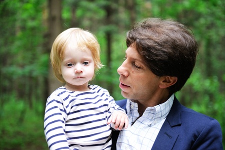 Young man and his adorable baby boy in summer forest