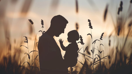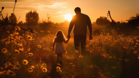 Silhouette of father and daughter in the field at sunset.