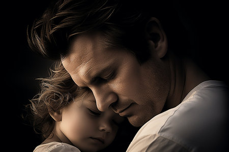 Tender embrace of a father holding his sleeping child, a moment of peaceful connection.