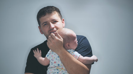 Emotional portrait of caring father holding his infant child lovingly