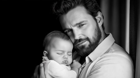 Tender black and white portrait of father cradling sleeping infant