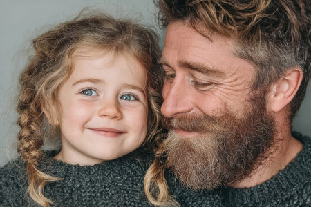Smiling child and father are sharing a joyful moment, both wearing cozy sweaters, showing warmth and affection in a close-up portrait.