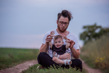 Seated on tranquil path, young, diversity father with happy son on lap, both enjoying peaceful twilight atmosphere in countryside. Man with hair bun, beard playing with funny boy