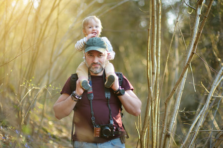 Cute funny toddler boy and his father hiking in the woods. Dad and son having fun on a walking trail on sunny spring day. Exploring nature with little kids.