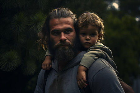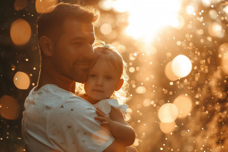Loving father gently holds his little toddler, showing a heartfelt parentchild bond amidst nature