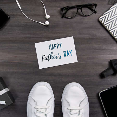 Fathers Day greeting card with men accessories, white casual sneakers, gadgets on dark wooden background
