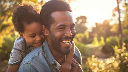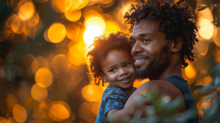 A father and son are seen in a warm embrace, illuminated by the golden light of the sun. The image showcases the bond between them, with soft colors and a blurred background suggesting an outdoor setting. This photograph could be utilized for various commercial purposes, including family-related content.