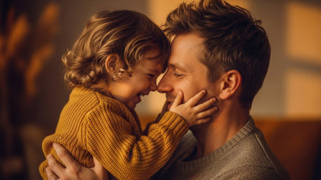 A father and child share an intimate moment, their faces touching in a tender embrace. Soft lighting illuminates the scene, highlighting the textures of their clothing and skin. The composition evokes feelings of love and connection. This image can be used in a variety of commercial and editorial contexts.