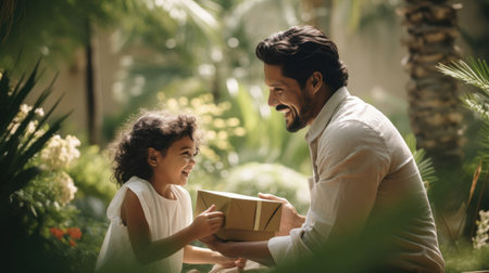 In a tranquil garden a parent hands a beautifully wrapped gift to their child