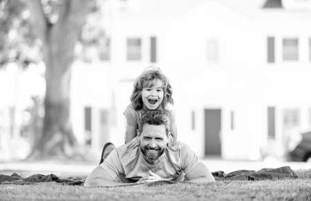 Happy son kid ride fathers back relaxing on blanket laid on grass summer outdoors, fun