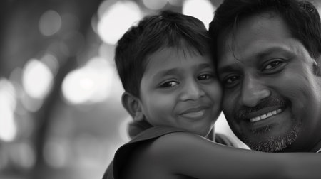 Black and white portrait of a father and son hugging in the park.