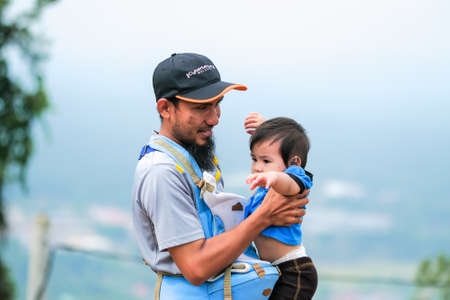Muadzam Shah, Malaysia - September 13th, 2020 : Hiking family having food at a top of Ridan Hill in Muadzam Shah, Malaysia. Family hiking on vacation.