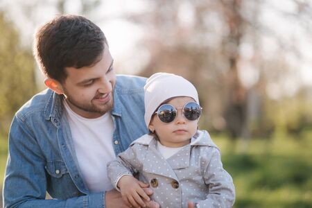 Cute little baby boy in his fathers arms. Dad and son having fun on warm spring day in city park. Adorable son being held by his daddy.