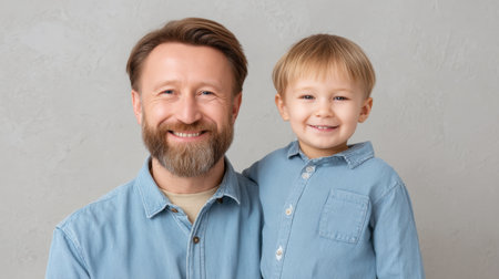A heartwarming portrait of a father and son showcasing their joyful bond. The duo wears matching blue shirts, radiating love, happiness, and togetherness in a neutral setting.