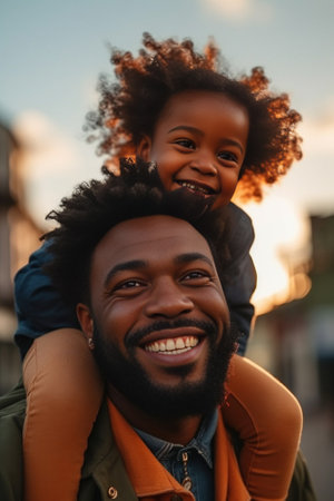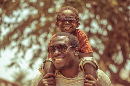 Joyful moments in nature as a black child rides on father's shoulders, both wearing sunglasses and radiating happiness under the sun