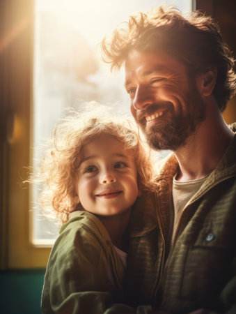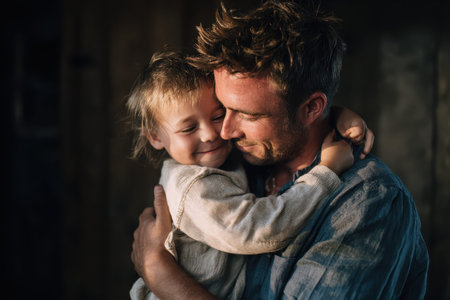 A father holds his child closely, both displaying serene expressions. Their mutual bond is highlighted by the soft lighting and gentle embrace, creating a sense of love and safety.
