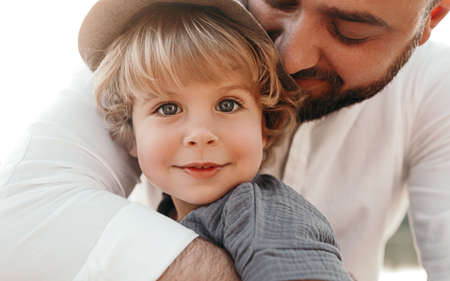 Man with a beard hugging his young son in close-up, both with warm expressions, highlighting a caring and intimate moment