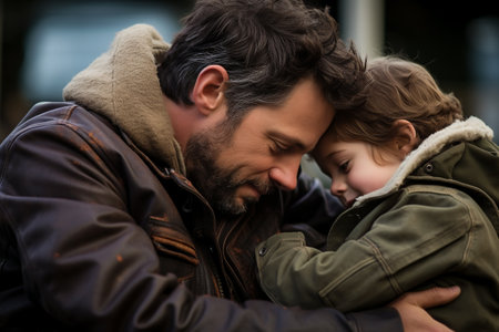 A man holding a child in his arms, AI