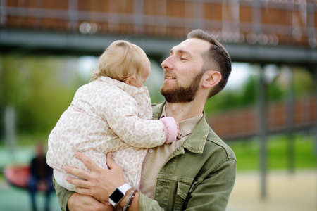 Cute toddler girl having fun on outdoor playground. Young father playing with his little daughter. Spring / summer / autumn active leisure for family with kids. Happy parenthood.